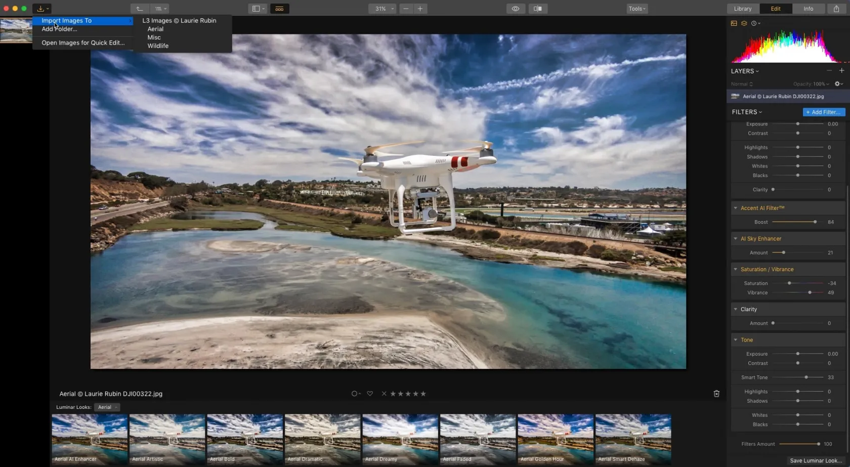 Luminar 3 is just around the corner, with an all-new photo organizing tool allowing aerial photographers to arrange thousands of shots, pick their favorites, group them by date, and sync edits across multiple photos at once. Plus, using the Lens correction and Transform tools you can fix perspective distortions. The batch editing feature allows you to quickly copy and paste edits to one or more photos in seconds. Some AI-driven filters can enhance your aerial photos with a single slider.