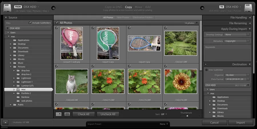 In the middle of your screen, you’ll see all the photos from the source you specified. Lightroom automatically assumes that you want to import all of the images in your chosen folder. If this isn’t the case, you’ll need to either uncheck the ones you don’t want (if it’s only a few), or hit the “Uncheck all” box and check the ones you want (if there are more unwanted photos). Once you’ve done that, it’s time to head on over to the right-hand column.