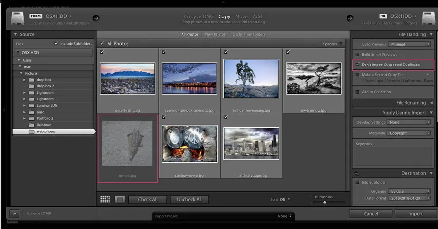 After you’ve decided what Lightroom will do with your files (Copy, Move, or Add) and selected which photos you want to import, it’s time to move over to the right-hand column. The right-hand column contains file-handling, file-renaming, metadata options, and finally your destination choices. You’ll want to take a look at each of these and set them according to what works best for you. One particularly useful option in the file handling area is the “Don’t Import Suspected Duplicates” box. This grays out any duplicate photos so you don’t end up with extraneous copies in the catalog.
