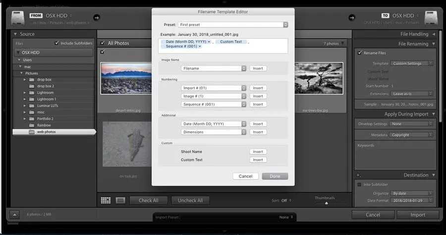 It’s also often helpful to rename your photos according to the way that will work best with your workflow. Lightroom offers a number of different templates for this, but you can also create your own. This can all be done from the Template drop-down menu.