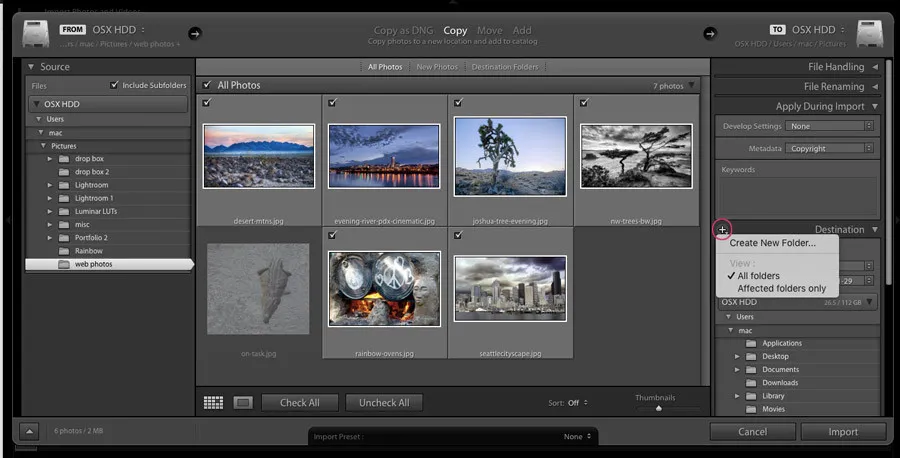 Next, you’ll want to give some thought to where you want the images to be stored. By default, Lightroom places its catalog and your image files in your “Pictures” folder. If this is where you want them to be, great. If not, you’ll need to create another destination folder—ideally before you begin importing.