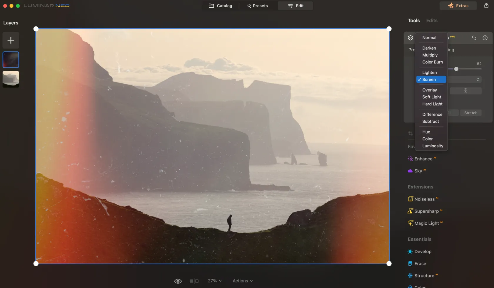 At its core, a blending mode operates by comparing the content of two layers and enacting changes based on the content of both. Think of it as a conversation between two colors, where they decide how to best present themselves when combined. Within Luminar Neo, you have the liberty to choose from a comprehensive list of 14 different blending modes, accessible through the pop-up menu located at the top of the Layers controls.