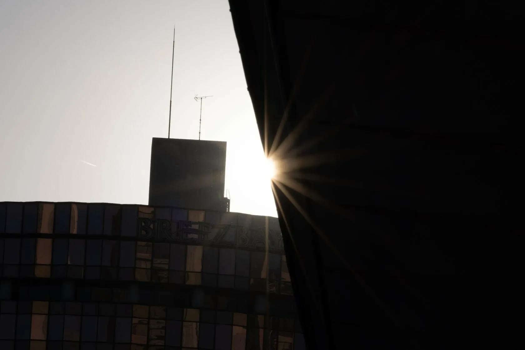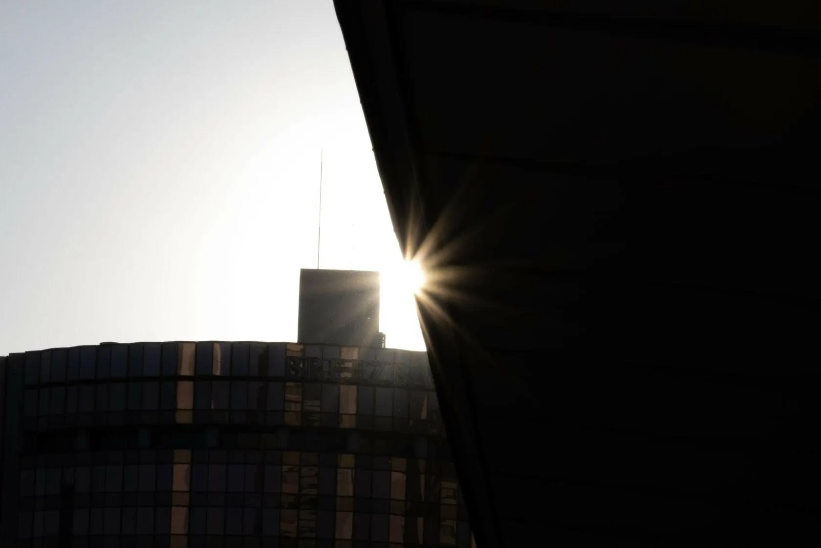 The trick is to hide the sun until only a tiny amount of light leaks through the obstruction. You can control the size of the rays by how much you hide them. If you make the sun as small as possible, you can create a subtle focal point, as shown in the photo below. This way, the light streaks will take a supporting role, making it easier to draw the eye to the cityscape.