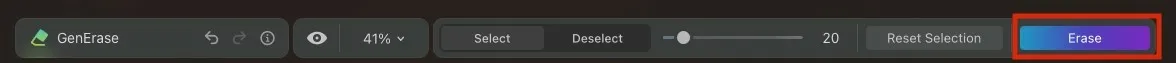 2. Paint the area you want to erase using the Generative Erase tool. Then, select “Erase” at the bottom of the screen, and the software will automatically process the correction.