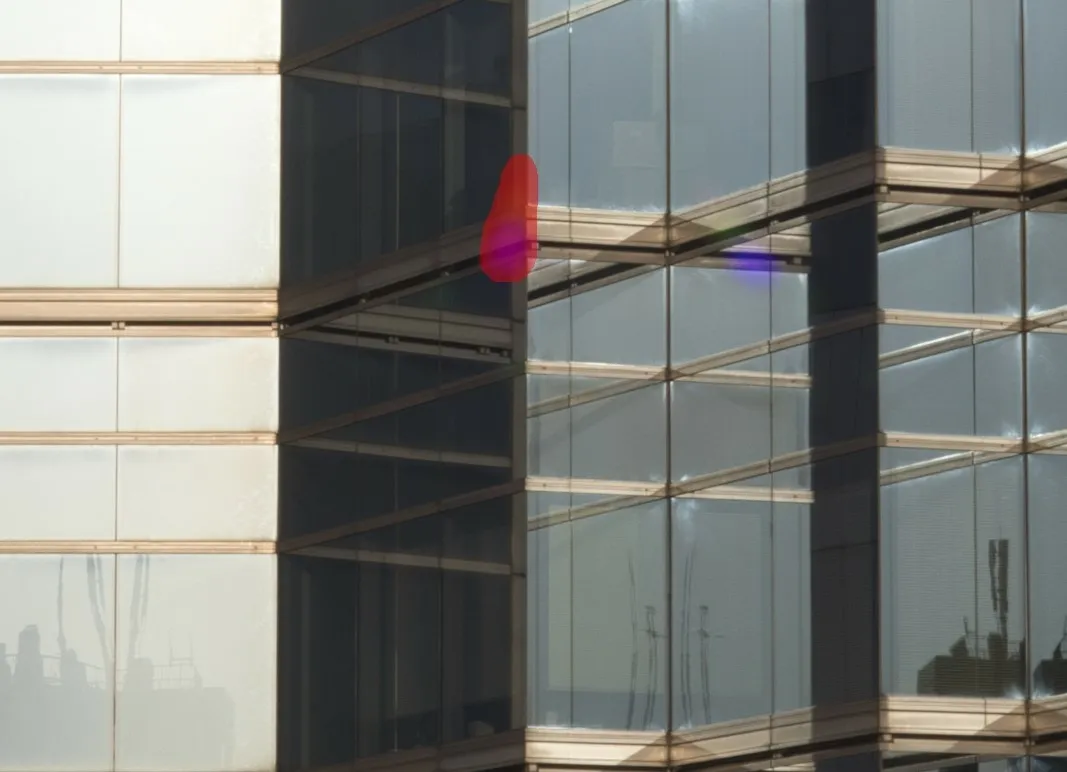 In this type of shooting, the light reflected from the glass of the building may cause a ghost flare, as seen in the blue frame of the photo below.