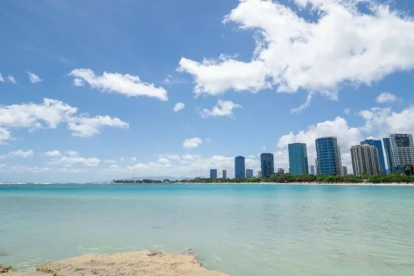 First, let’s use Sky Enhancer AI to correct this landscape photo of Hawaii’s beautiful ocean, modern buildings, and vast sky. The photo below has been edited using Sky Enhancer AI at 60. This tool is especially useful for improving dull or overcast skies, and just by moving the Sky Enhancer AI slider, the pale sky changed to a deep blue, and the flat white clouds became more three-dimensional, creating a dynamic sky. The tool can also replace the sky in the photo, enhancing the overall mood and visual appeal.