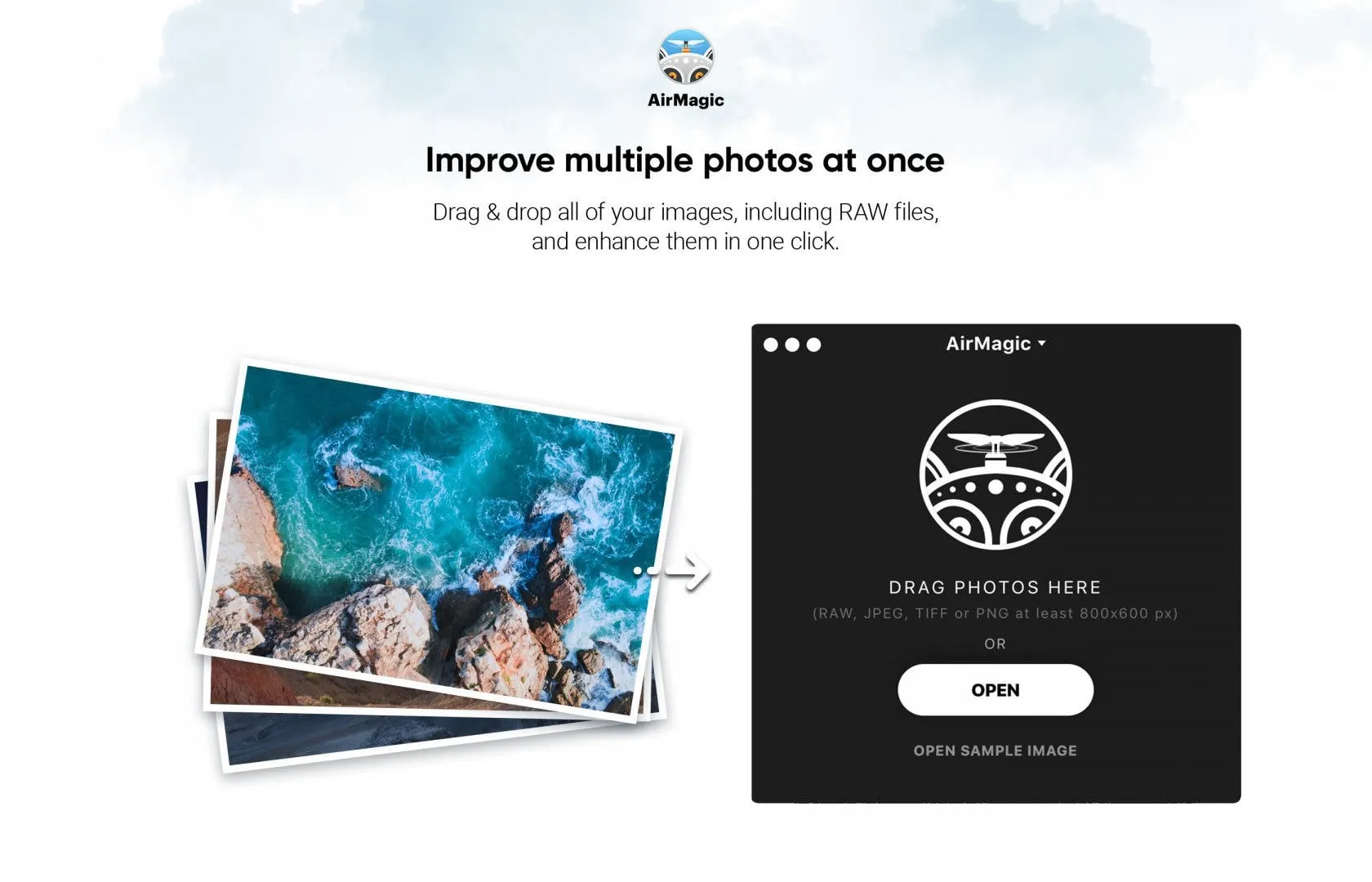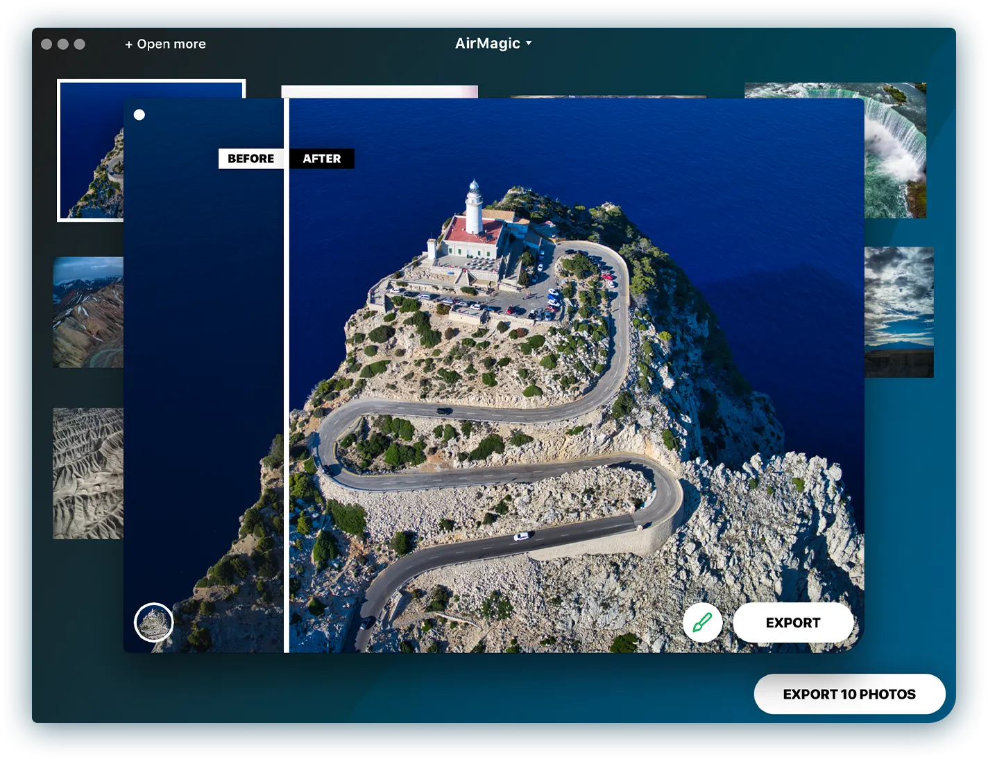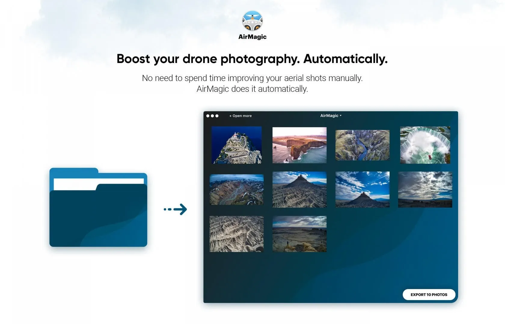 With AirMagic, these problems are a thing of the past. AirMagic was created to resolve issues inherent to aerial photography automatically. It lets photographers process their images without major involvement — all you need to do is drop all your aerial photos into the app, and AirMagic takes care of the rest to make each photo look its best.