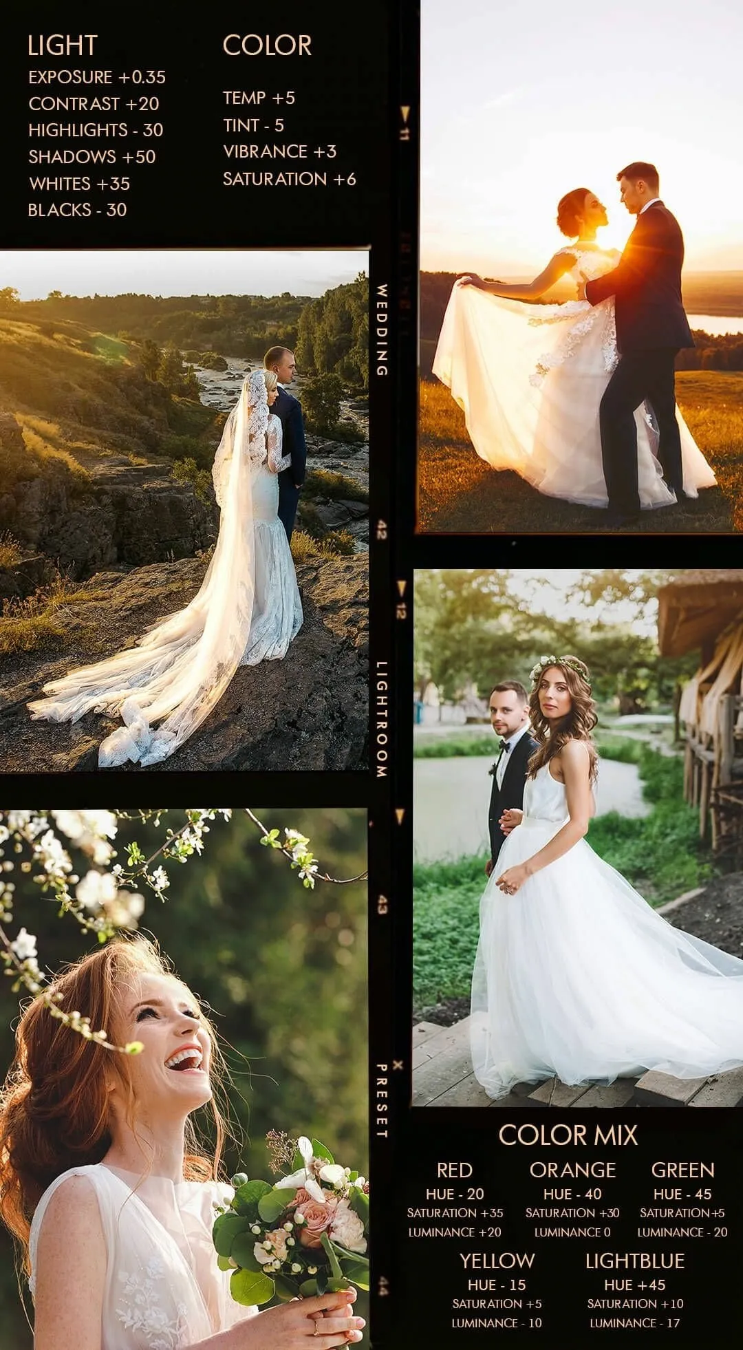 Perfect for post-processing when it’s important to create a warm atmosphere. It is good for portraits, wedding photos, and outdoor photos in good natural light. It is a package of special settings with selected tonalities and contrasts that will improve the images for use in your wedding photos.