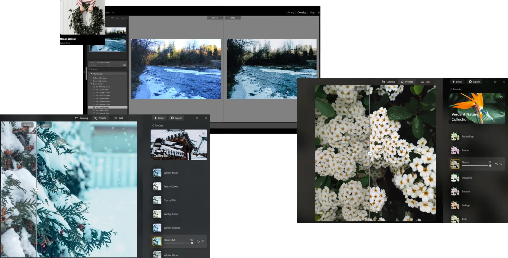 For example, Verdant Nature by Steve Roe highlights the greens and blues, which work perfectly for landscapes or outdoor portraits. Snow Zen, by the same author, adds fresh, crisp tones to winter scenes, while Green Winter, by Jakub Bors, brings lively splashes of color to holiday photos, making them really stand out.