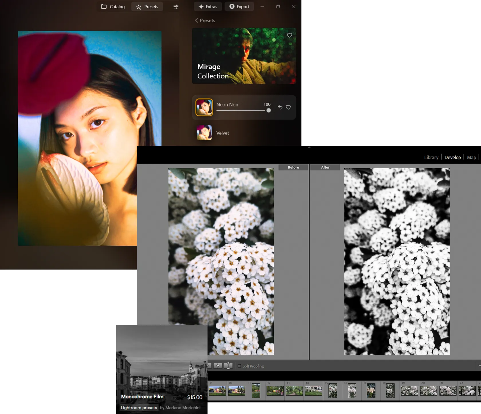 For example, Monochrome Film by Mariano Morichini turns your pictures into striking black-and-white images with deep, rich contrast—great for creating timeless portraits. Meanwhile, Steve Roe’s Mirage copies the look of classic film, perfect for adding a creative, artistic vibe to your images.