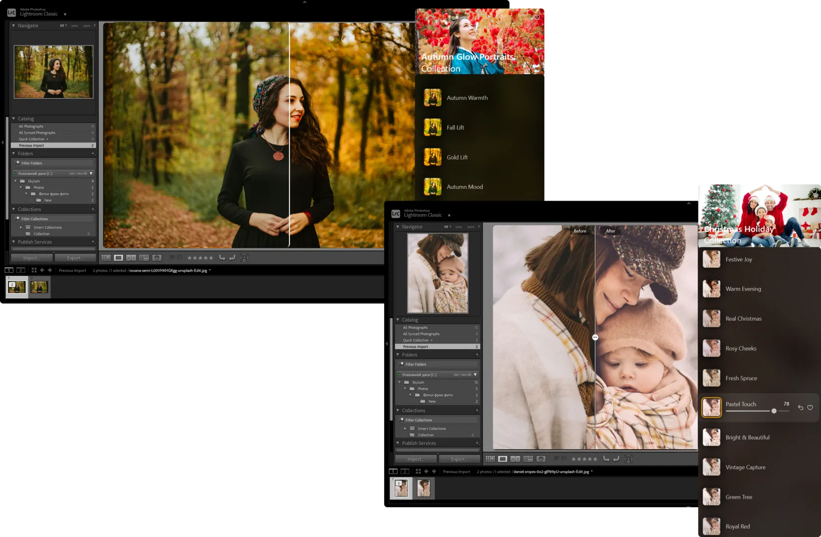 For example, Autumn Glow Portraits by Steve Roe warms up the colors and gently softens the highlights, making it ideal for romantic portraits or wedding shots. Christmas Holiday by Jakub Bors adds a clean, fresh brightness with a cozy holiday touch.