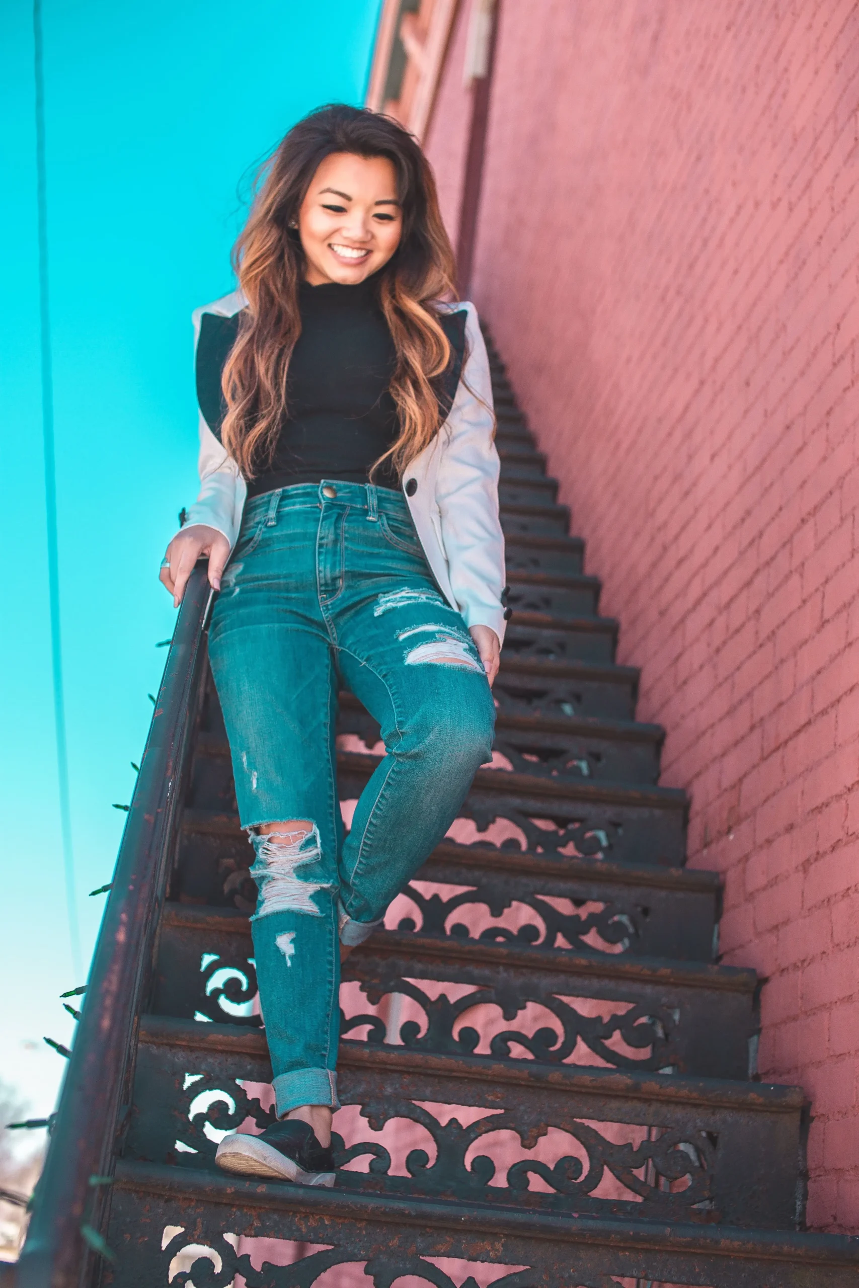 For this pose, you’ll need a ladder. Place the model facing the camera and ask her/him to step down on the bottom step, with her/his other foot remaining on the previous step. If you are photographing a girl, it is ideal if she is wearing a long dress. One of the best photography models poses.