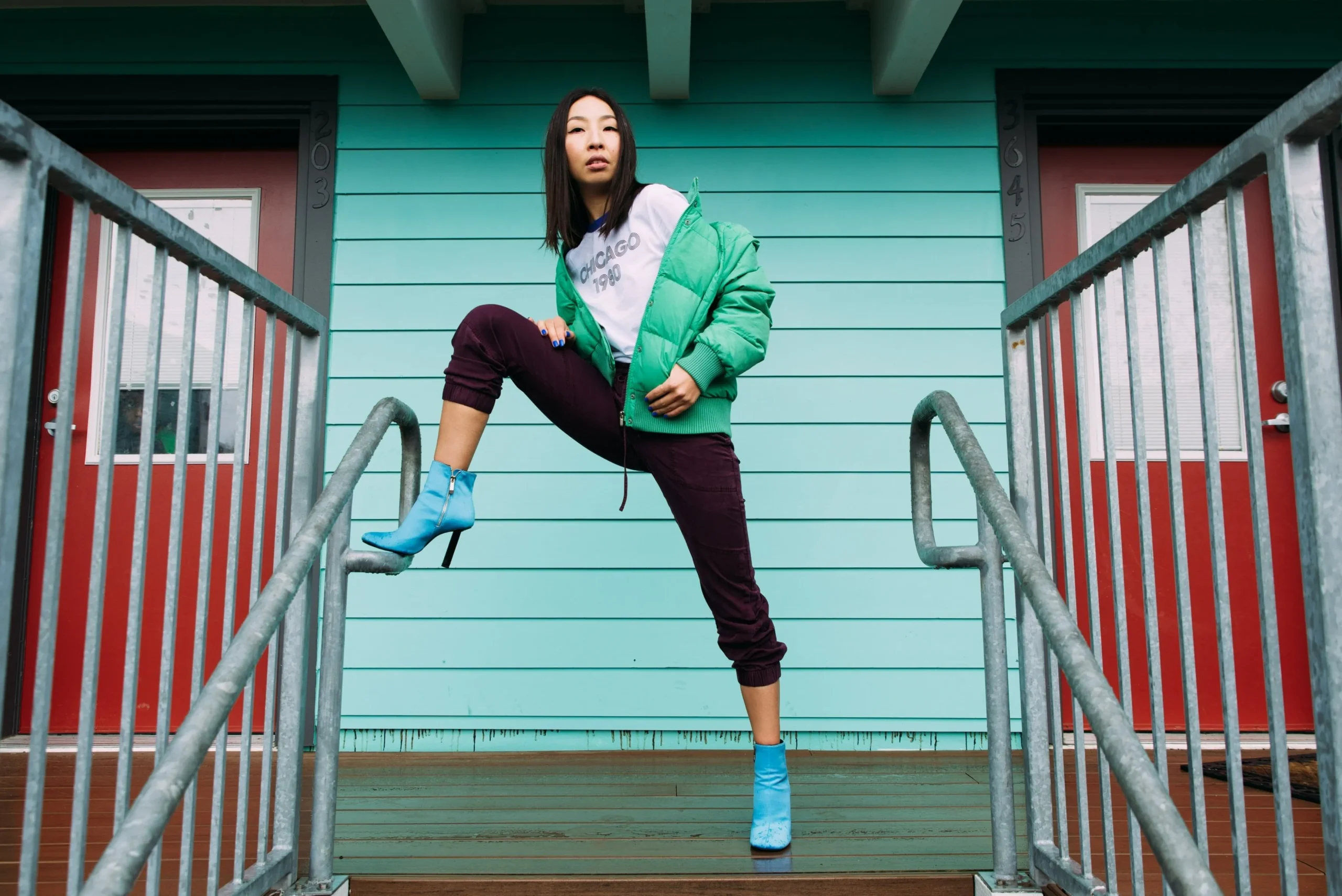 If you want to take great clothing shots but don’t want to use standing poses, ask your model to sit sideways to you, lean over and touch his/her boot.