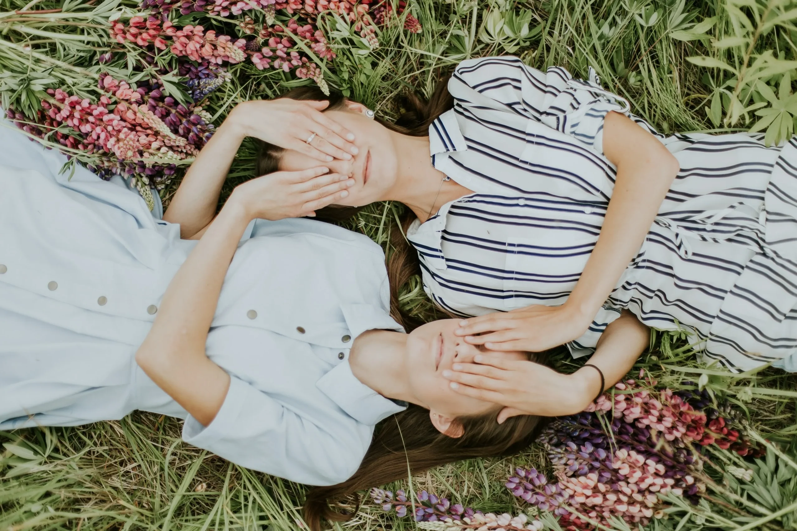 The top-down photo is unconventional and original. You don’t need to shoot from the usual angles at all. One of the best cute sisters’ poses for pictures is when the sisters lie facing one or the other way. The plus side is that you do not need special props to bring this idea to life. It could be a meadow or a flower farm where they will look as natural as possible.