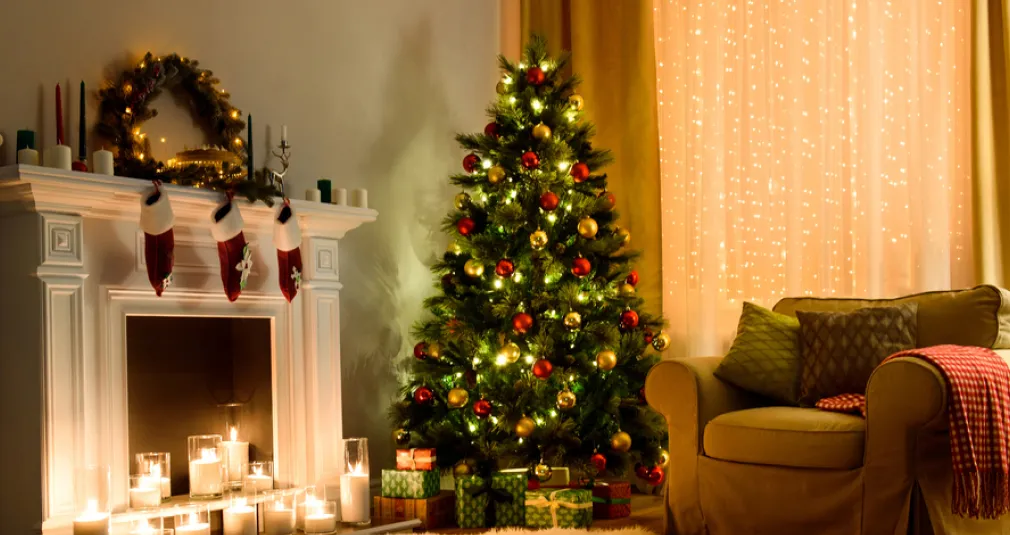 Home is where the heart—and the tree—is, making it the ideal location for snapping a festive photo. First, set the scene. Clean up the background so that the tree and subject stand out. Add warm touches, such as blankets, fairy lights, or candles, for added atmosphere.