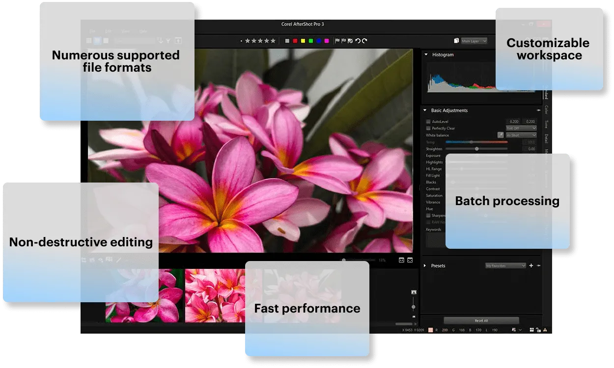 Fast performance: AfterShot Pro 3 is optimized for the fastest processing. It provides a smooth and speedy workflow without compromising the original image quality.