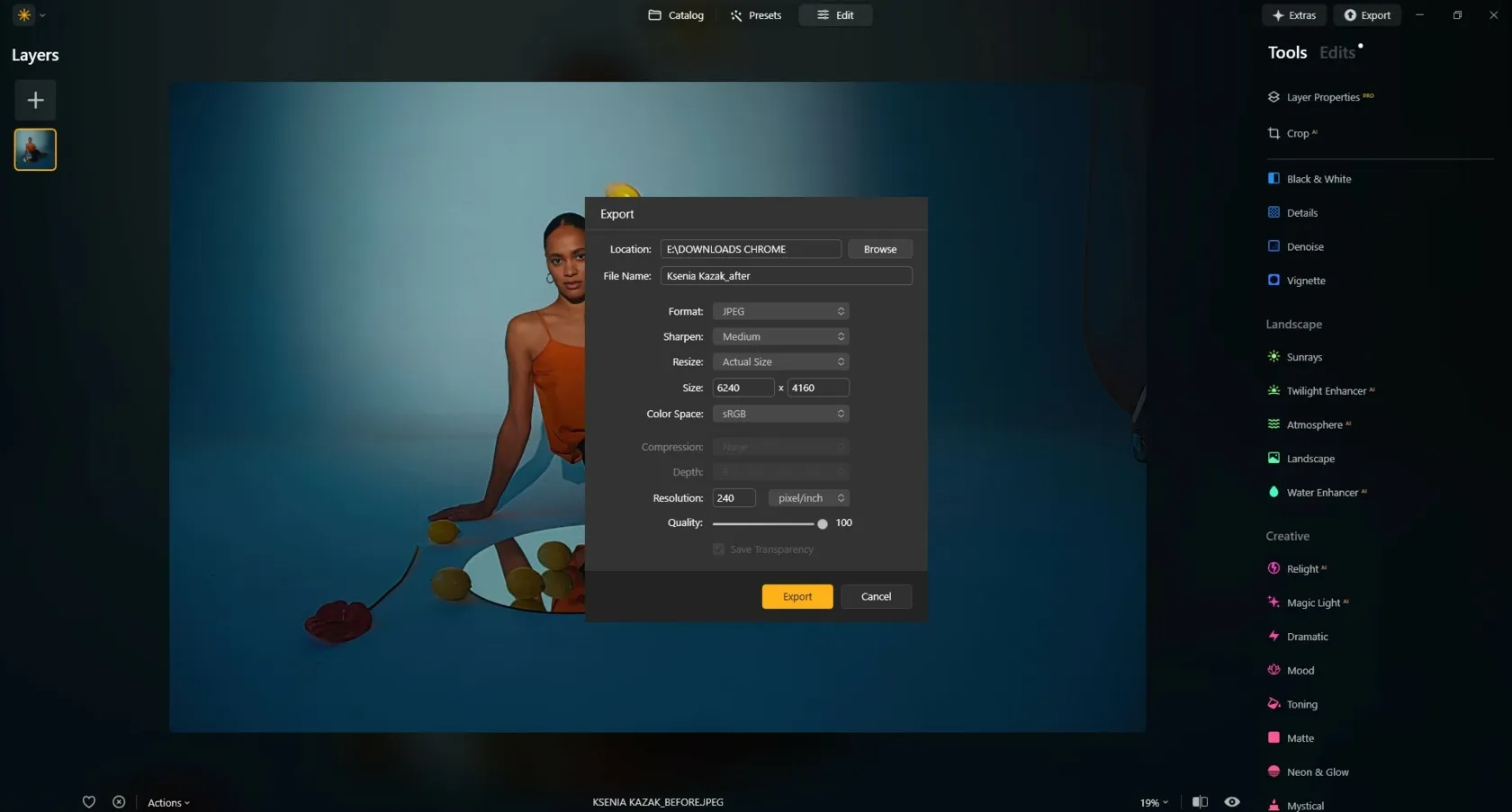 Jakmile budete s výsledkem úprav naprosto spokojeni, klikněte na „Soubor“ a zvolte „Sdílet do“, čímž fotografii uložíte. Luminar Neo umožňuje zvolit kvalitu a formát výsledného souboru podle vašich potřeb.