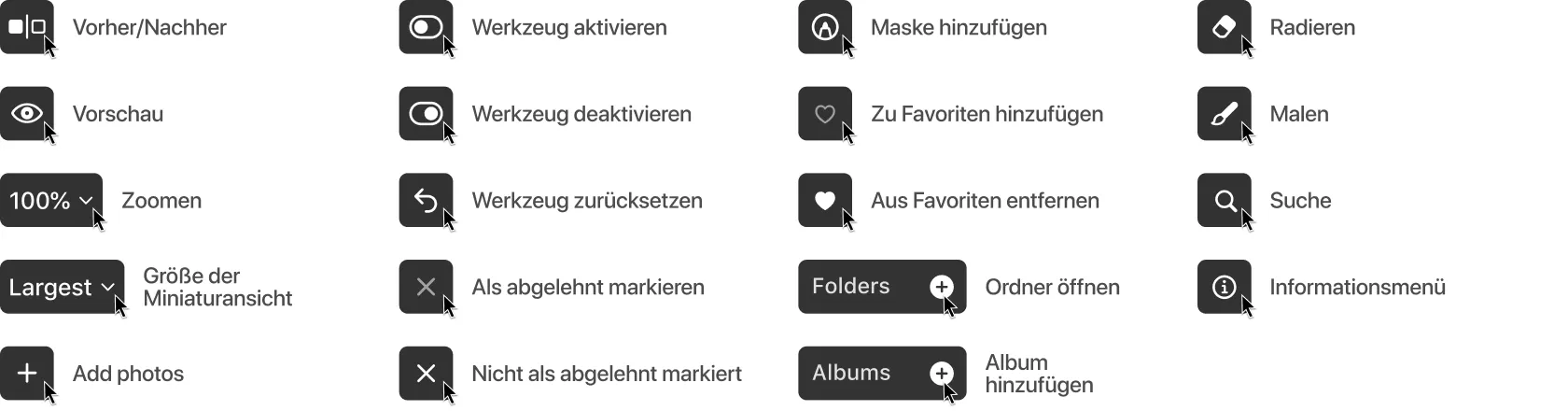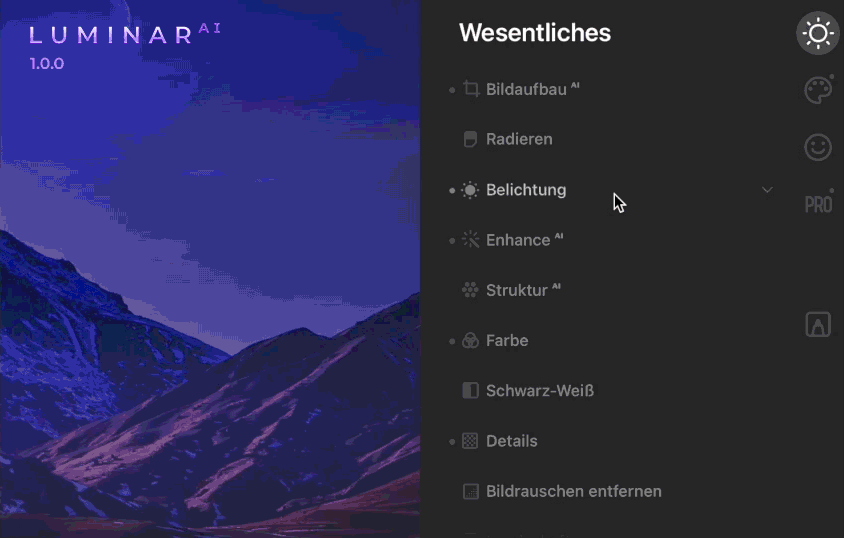 Bewege den Mauszeiger über die Symbole in LuminarAI und du kannst jetzt erfahren, was die einzelnen Funktionen bewirken und wie sie dir helfen können, bessere Bilder zu machen. Erkunde LuminarAI auf eine neue Art und Weise und finde alle Werkzeuge, die du brauchst.