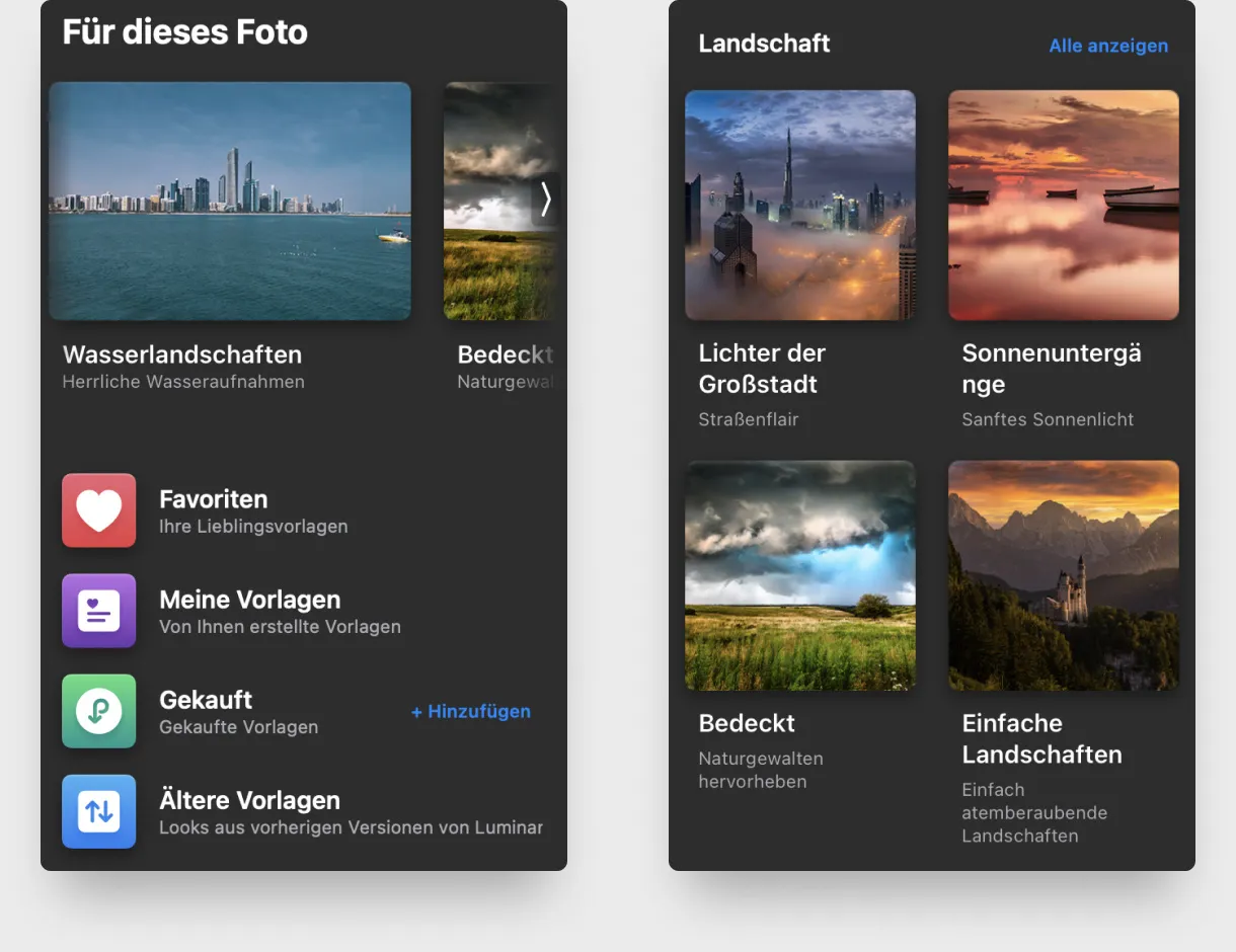 Einfacher Zugriff: Um sie leichter zu finden und zu verwenden, sind alle Vorlagen, einschließlich Favoriten, gekaufte Vorlagen und ältere Vorlagen, jetzt auf der Hauptregisterkarte „Vorlagen“ direkt unter „Für dieses Foto“ verfügbar.