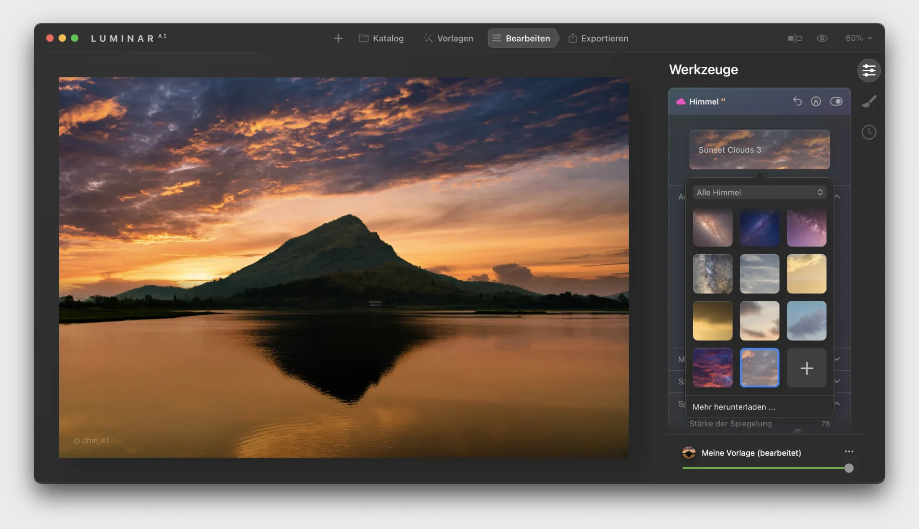 Willst du eine größere Auswahl an Himmeln, um mehr Abwechslung in deine Bilder zu bringen? Erweitere deine Himmelssammlung ganz einfach, indem du auf Mehr Himmel holen drückst. Das führt dich direkt zum Marketplace, wo du wunderschöne neue Himmel erwerben kannst, die von professionellen Fotografen auf der ganzen Welt aufgenommen wurden.