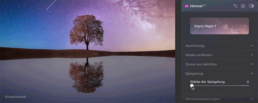 Der neue Himmel passt sich automatisch an den Winkel und die Tiefe der Szene an und achtet dabei sogar auf die kleinsten Details, um unglaubliche Ergebnisse zu erzielen. Sobald der neue Himmel eingefügt wurde, verwende den Schieberegler Reflexionsstärke, um die Intensität der Reflexion nach Belieben anzupassen.