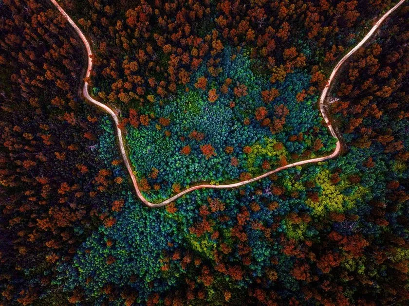 „Dieser Wald, in den ich mit dem Geländewagen fahre, ist kein fotogenes Gebiet. Er ist schlammig, und die Bäume sehen alt und abgenutzt aus, aber die Perspektive macht dieses Foto so schön. Wenn man ihn von oben betrachtet, sieht er wie verzaubert aus“ – Theodore Koustas, Gewinner des Fotowettbewerbs The Sky is the Limit