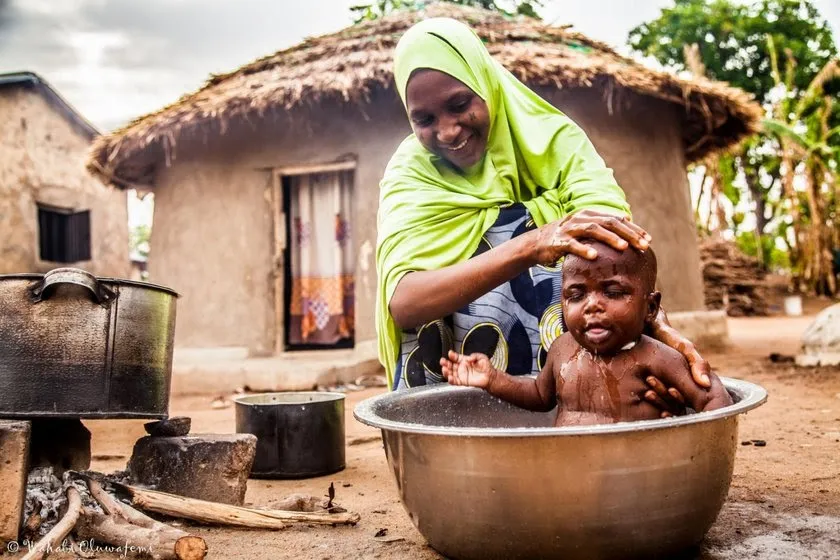 „Dieses Bild zeigt die Synergie mit der Kombination von Farben. Das Lächeln auf dem Gesicht der Mutter, wenn sie morgens ihr kleines Baby badet, zeigt, wie schön die Welt sein soll“ – Oluwafemi Wahabi, Gewinner des Familienfotowettbewerbs