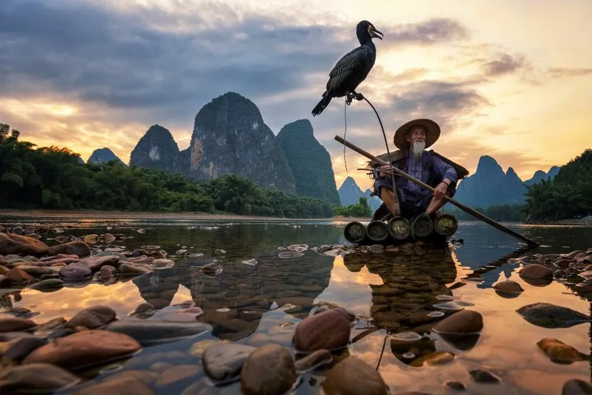 „Hier ist ein traditioneller Kormoranfischer in China zu sehehn, der in den frühen Morgenstunden arbeitet. Er segelt auf seinem Bambusfloß mit seinem dressierten Kormoranvogel, um Fische im Fluss zu fangen“ – Duangmon C., Gewinner des Fotowettbewerbs Picture Perfect Travel
