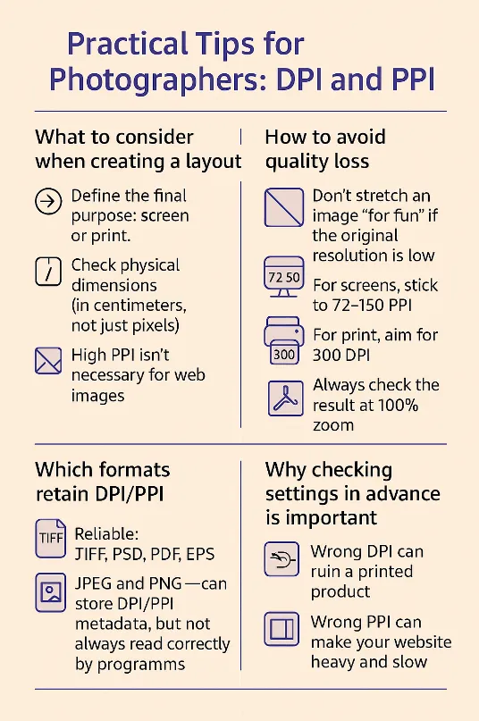 If you misunderstand the difference between DPI and PPI, you may end up with a low-quality image on screen or in print. Incorrect use affects image clarity in digital format and image detail. Converting DPI to PPI correctly allows you to prepare a file without errors. The screen is measured in PPI, while printing is measured in DPI. Correct settings save time and money by preventing blurring or loss of detail in the final result.