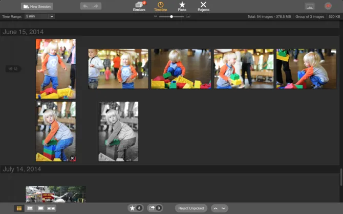 To get started with Snapselect, you load your images from a camera, a folder on your hard disk or an iPhoto, Aperture, Lightroom library (and very soon Photos for Mac libraries as well). From there, the application orders everything by similar objects, date, faces, which makes finding duplicate photos extremely easy. The application can also show you full metadata and histograms for each image.