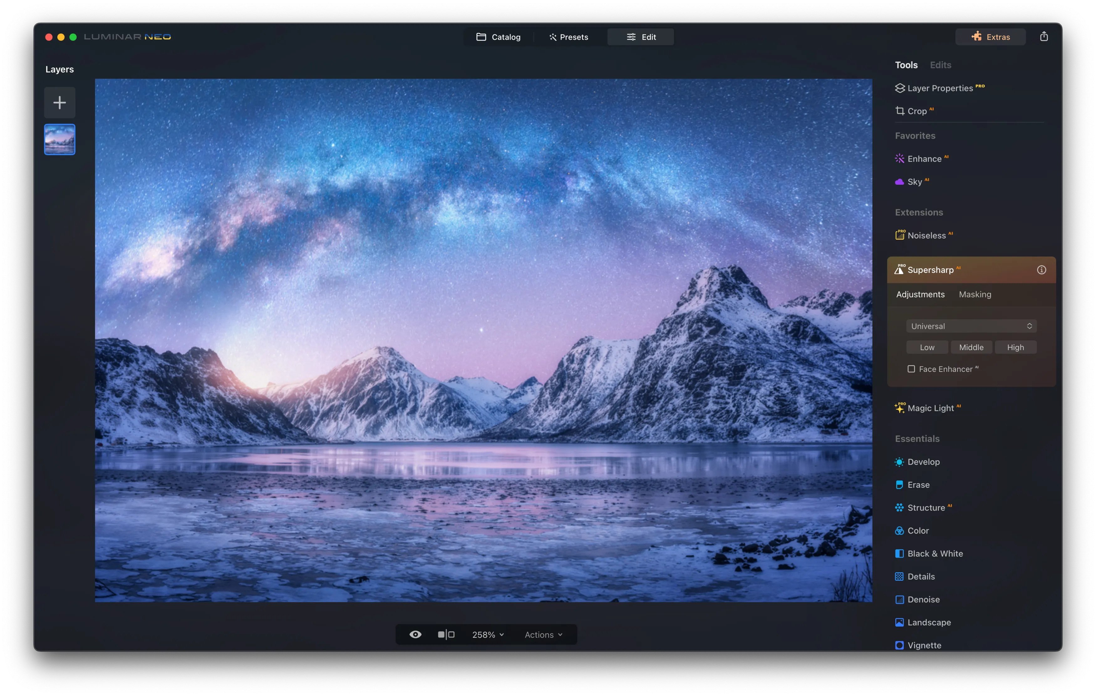 When you start using Luminar Neo, you’ll notice that it’s really easy to get around. The main parts of the software are the Catalog, Presets, and Edit, and you can switch between them at the top of the screen.
