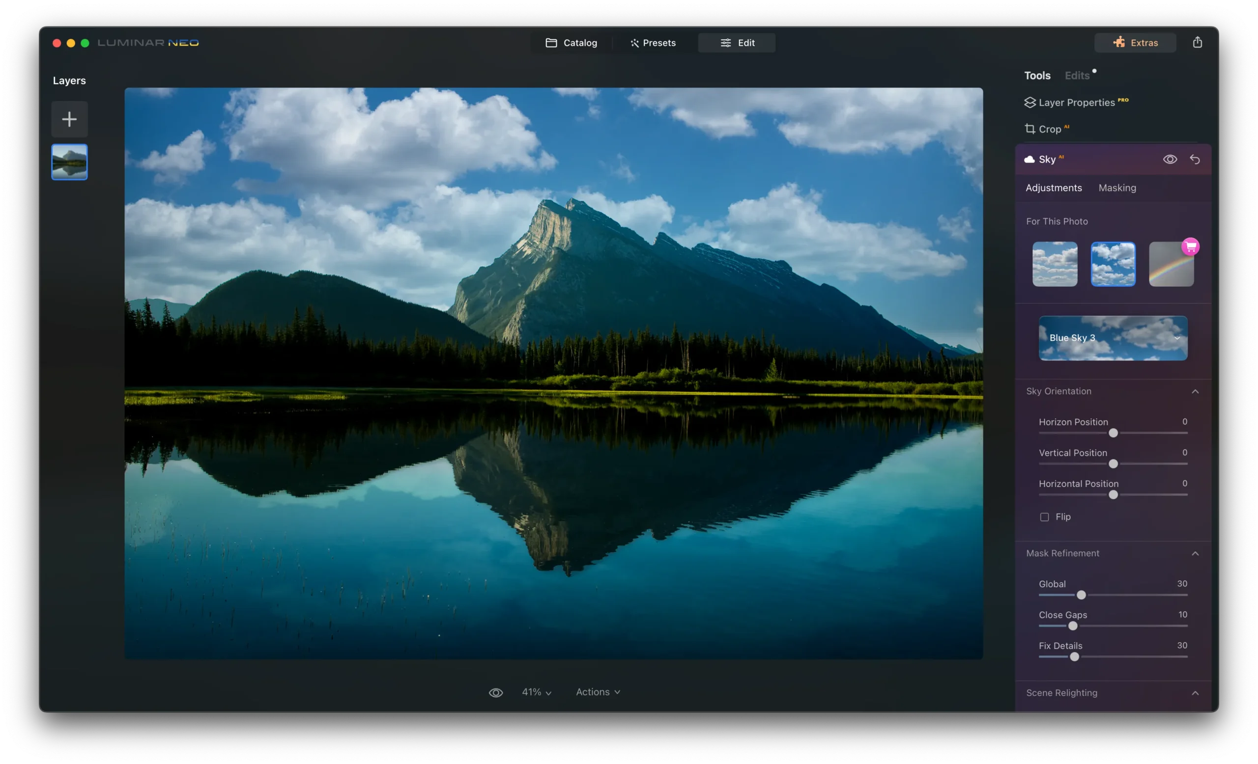 Sky AI: Automated algorithms detect the sky in the image and replace it with a new sky that you can choose from Luminar’s library or download from your computer. The lighting of the image will change to align with the new sky, and if your image features water, the reflection of the new sky will appear in it.
