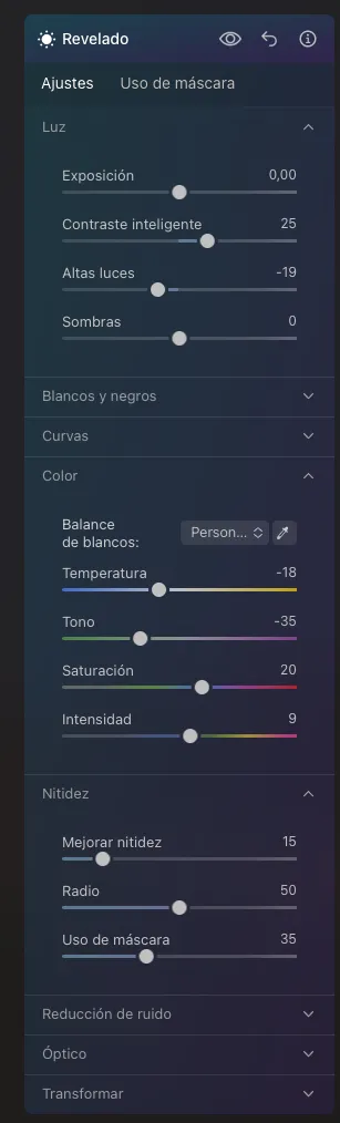 Empezamos usando el panel de Revelado, aplicamos ajustes varios para dejar las luces, sombras, contraste a nuestro gusto.