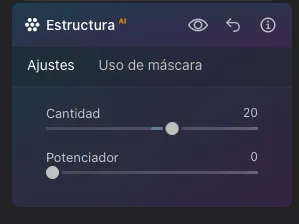 Vamos a realzar los detalles de nuestra escena, la herramienta de Estructura AI nos ofrece la posibilidad de realzar las texturas de la foto sin esfuerzo. Vamos moviendo el deslizador hasta encontrar el punto que consideremos correcto.