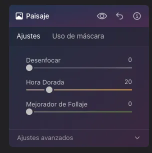 Vamos a mejorar el momento de la hora dorada, con la herramienta Paisaje mejoramos los tonos de la Hora Dorada de nuestra foto, creando unos colores más cálidos del atardecer. Si tuviéramos un primer plano de vegetación podríamos usar la opción de mejorador de Follaje, pero en esta foto no resulta interesante.