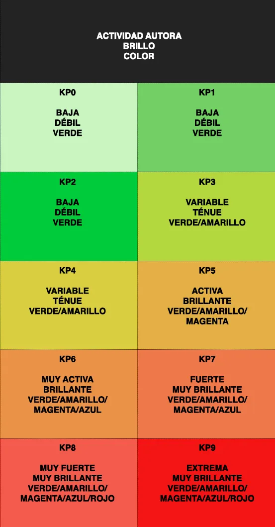 La intensidad de las auroras se suele medir en una escala conocida como la «escala KP» . El Kp es una forma de cuantificar la actividad geomagnética en un rango que va desde 0 hasta 9, donde cada número representa un nivel específico de actividad magnética. Esta escala se utiliza para informar sobre la probabilidad y la intensidad de las auroras boreales y australes en diferentes ubicaciones alrededor del mundo. Según la escala las auroras pueden emitir unos colores característicos.
