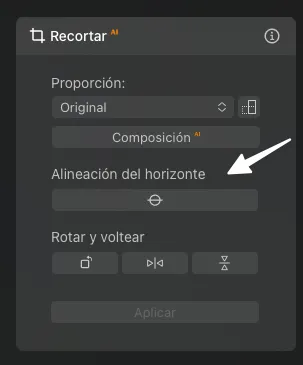Utilizamos la herramienta de recortar para corregir a nivel nuestra fotografía. Pulsamos Alienación del horizonte. Automáticamente analizará la foto para dejarla a nivel.