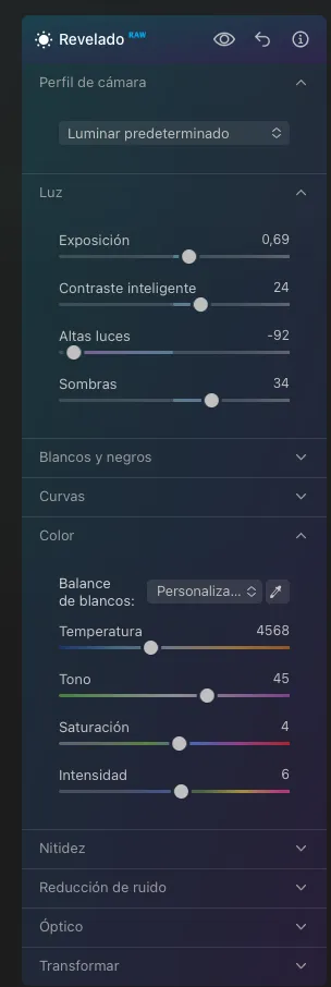 Ajustaremos la exposición, contraste, altas luces y sombras en el Panel de luz.