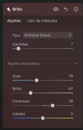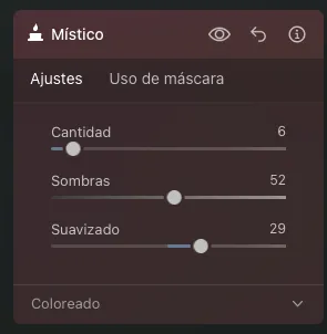 Luminar Neo ofrece una amplia variedad de efectos creativos que puedes aplicar a tus fotos de auroras para crear un estilo único. Me gusta recrear la atmósfera que tuve al capturar esta impresionante foto con diferentes efectos. En esta caso he elegido Brillo y Místico.