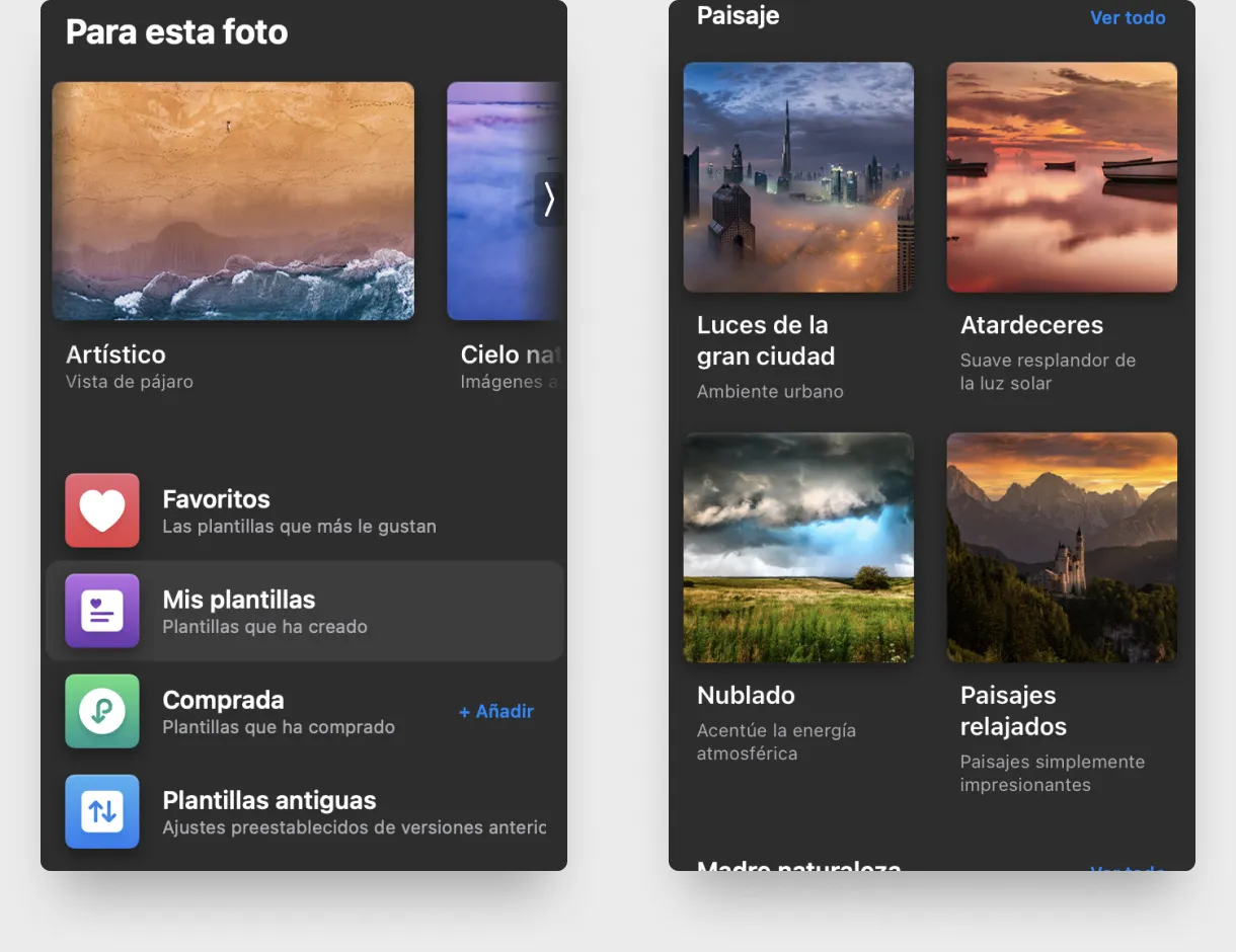 Fácil Acceso: Para que sean más fáciles de encontrar y utilizar, todas las plantillas, incluidas las favoritas, mis plantillas compradas y las plantillas heredadas, están ahora disponibles en la pestaña principal de plantillas, justo debajo de Para esta foto.