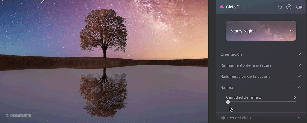 El nuevo cielo se ajusta automáticamente al ángulo y la profundidad de la escena para producir resultados increíbles hasta en los detalles más pequeños. Una vez que el nuevo cielo esté en su lugar, utilice el control deslizante Cantidad de reflejo para ajustar la intensidad del reflejo a su gusto.