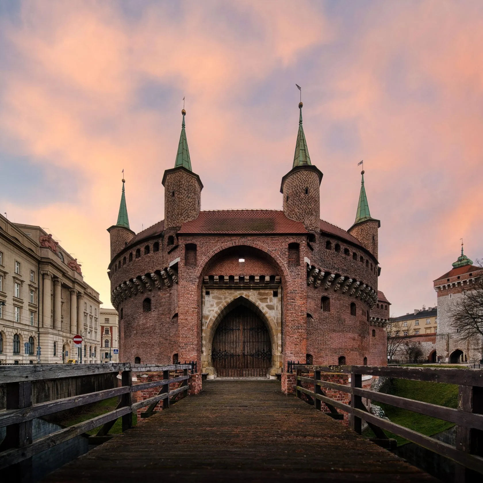 Barbakan is a circular brick gateway built during the 15th century to defend the city. Once linked to the city walls, it is now part of the city’s Historical Museum. The structure features seven towers, thick walls, and a moat. Its imposing Gothic design, complete with arrow slits and turrets, looks especially dramatic during the golden hour and in low light.
