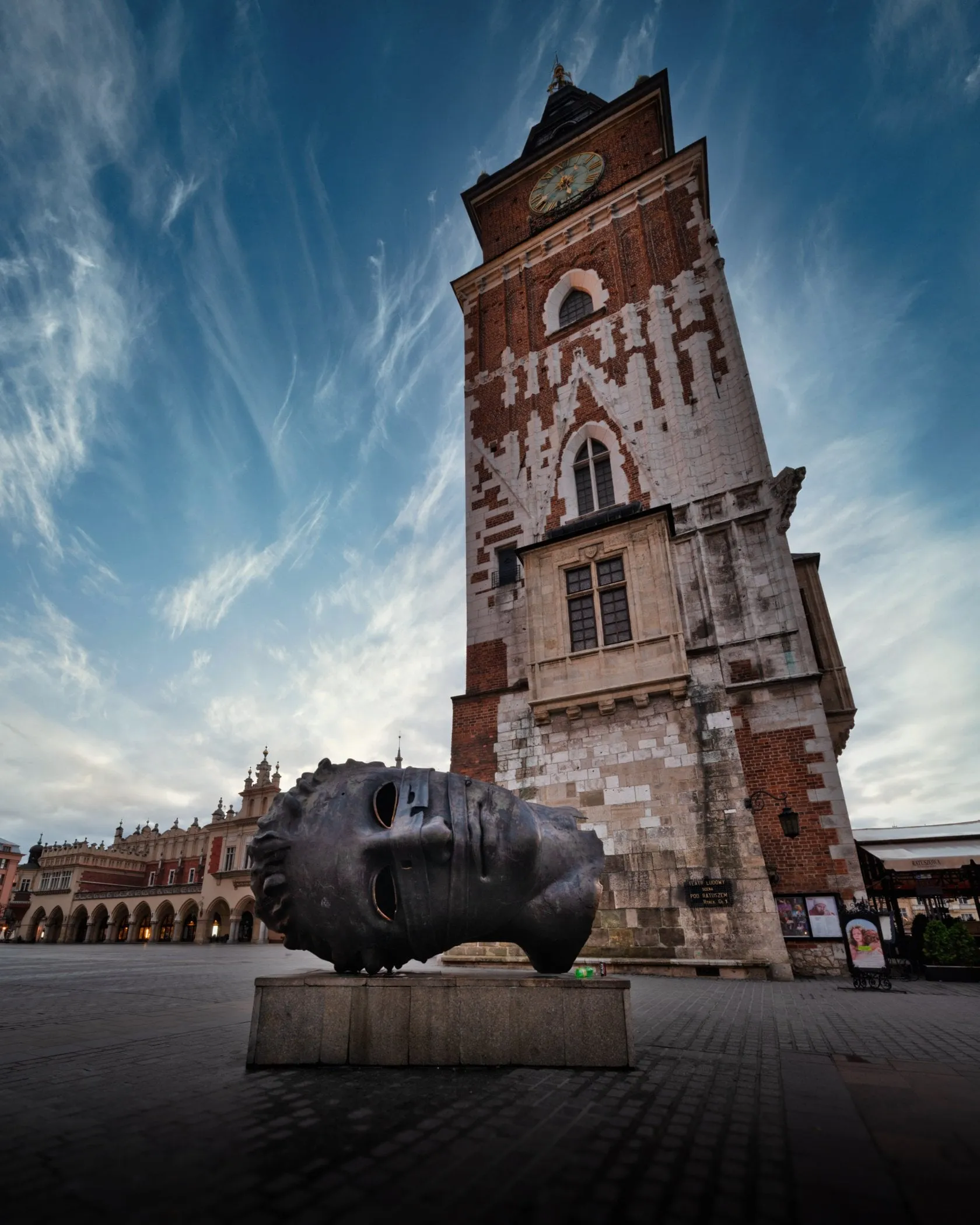 Polish artist Igor Mitoraj created “Eros Bound,” perhaps one of Krakow’s most recognizable sculptures and popular selfie spot. It is located in the Main Square near the Town Hall Tower. This giant bronze sculpture depicts a hollow face lying on its side. Visitors often interact with this surreal sculpture, climbing inside its hollow form for photos and selfies.