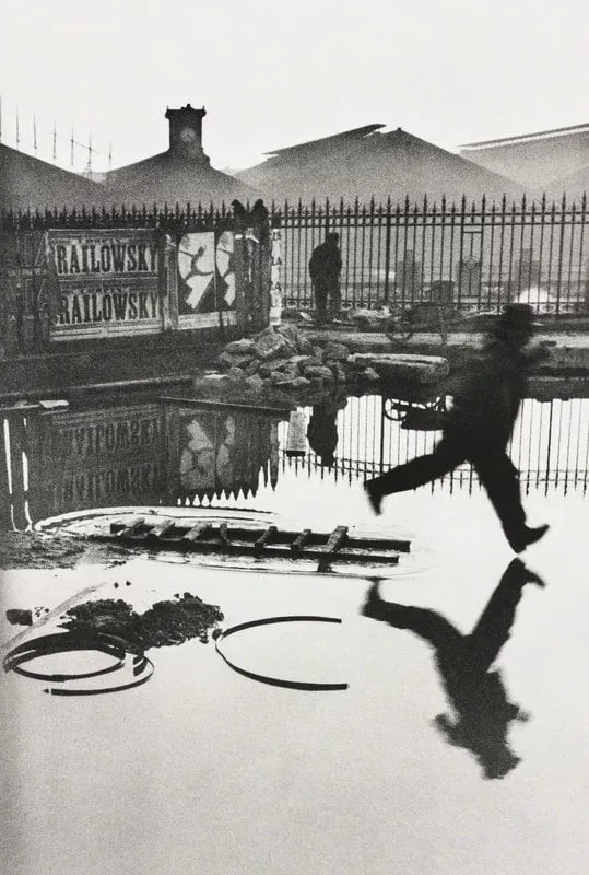 The unique framing of this image was a result of Cartier-Bresson working within constraints; he was looking through a plank fence that partially obscured his view. He shared, “There was a plank fence around some repairs behind the Gare [Saint] Lazare, and I was peeking through the spaces with my camera eye… The space between the planks was not entirely wide enough for my lens, which is the reason the picture is cut off on the left.” This narrative adds depth to our understanding of Cartier-Bresson’s philosophy of the “decisive moment.