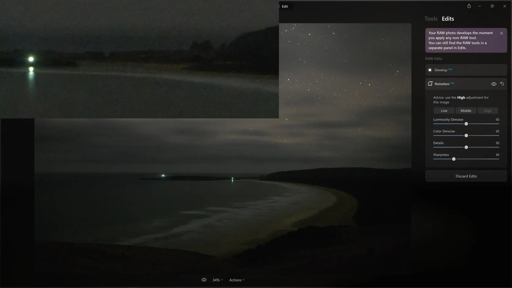 Bien qu’il ne soit pas recommandé de pousser les paramètres aussi fortement dans le cadre d’un montage concret, en appliquant les curseurs de manière agressive, nous pouvons constater que la luminosité et le bruit des couleurs ont été efficacement éradiqués. En revanche, la forme des objets a été renforcée. Les bords du mur de pierres sont nets, et les étoiles sont à nouveau des points lumineux.