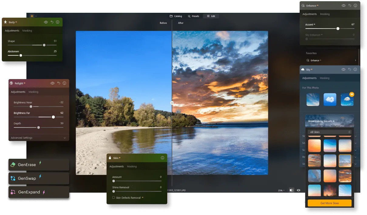 AI tools for sky replacement, skin retouching, and power line removal.