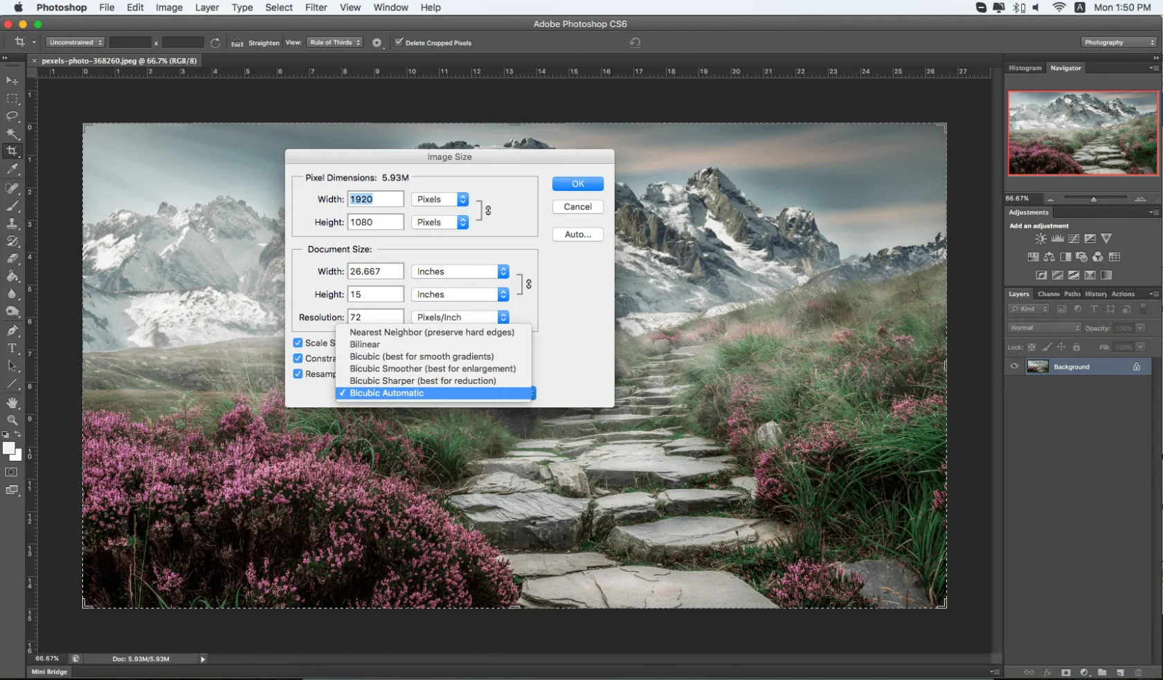 - Choose the resampling type: Bicubic (for gradients) or Bicubic Smoother (for enlargements)