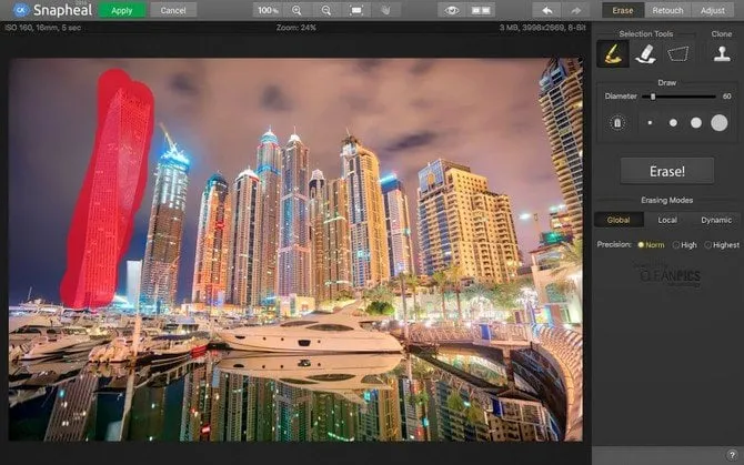 Snapheal CK has two modes: Erase and Retouch. Highlight and get rid of unwanted elements or heal any drawbacks of skin or any other surface.