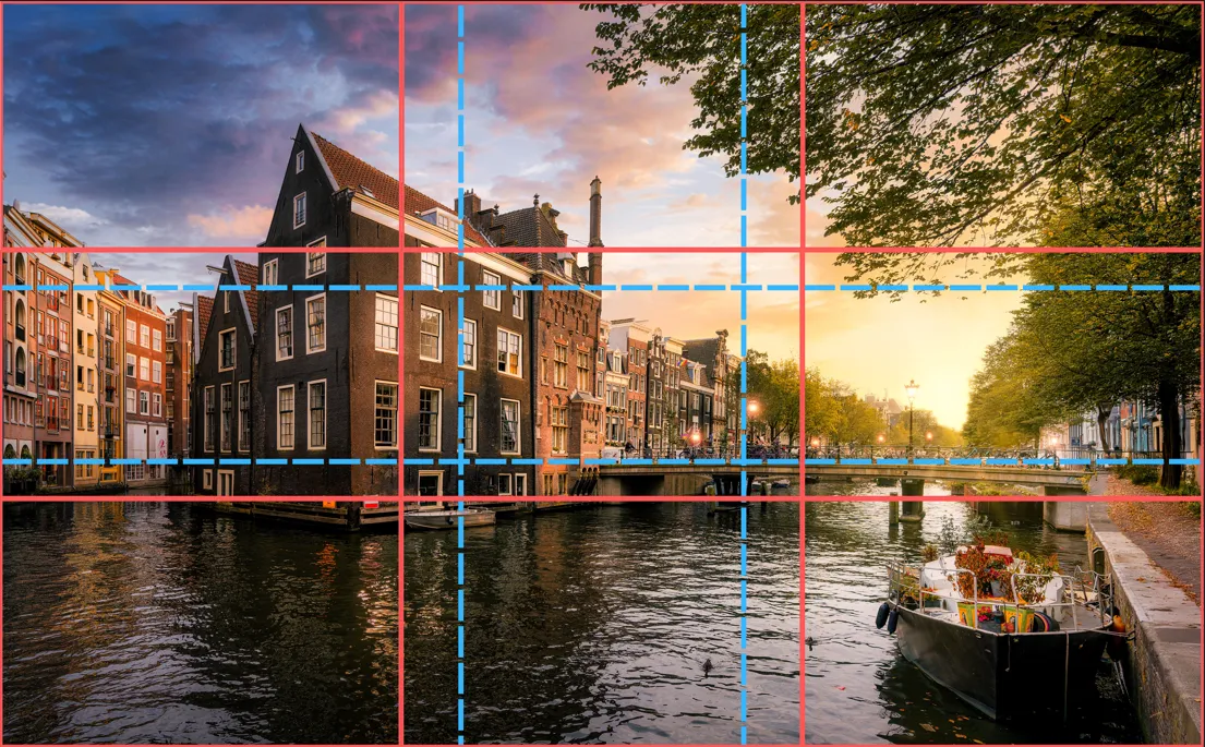Align horizons, buildings, or leading lines along the horizontal or vertical grid lines.