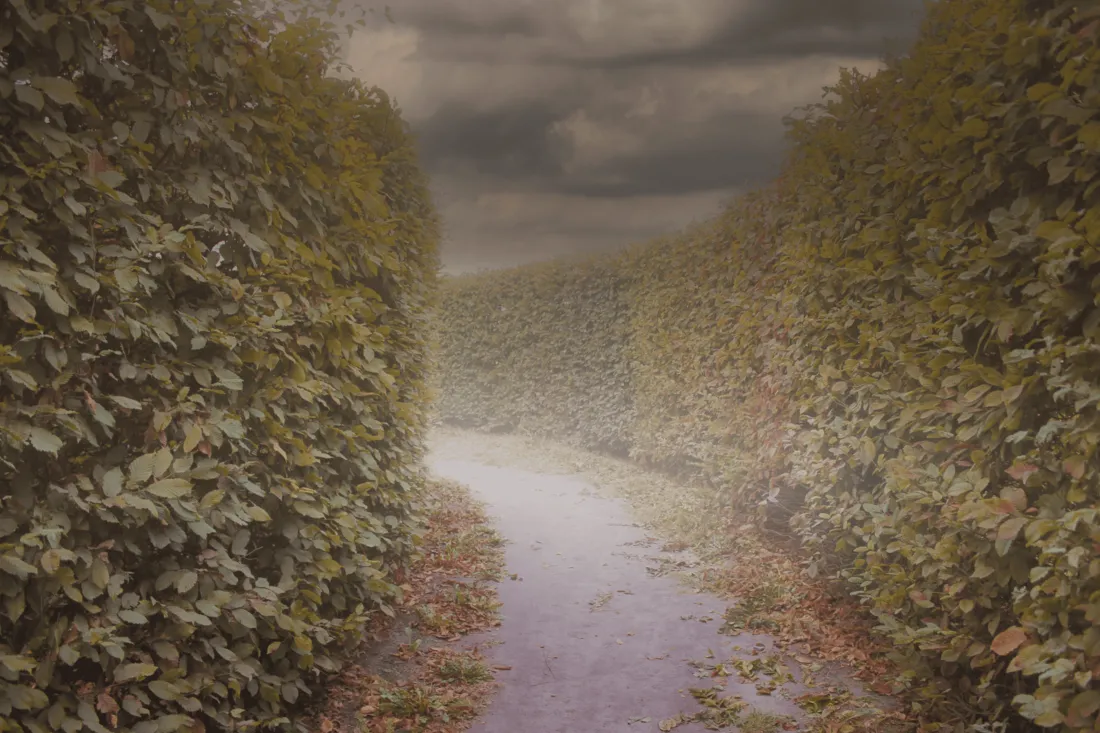 Add fog, use strong contrasts of light and shadow, and apply textures and color filters for gloomy shades.